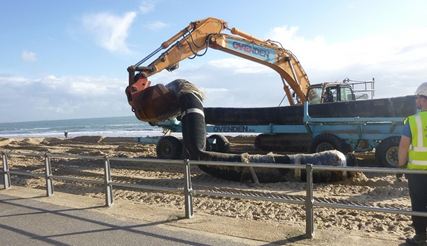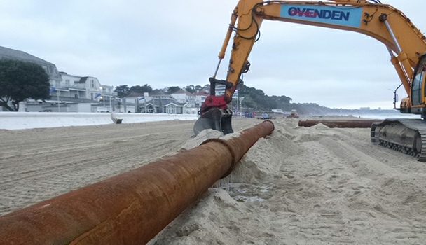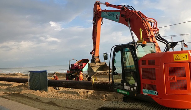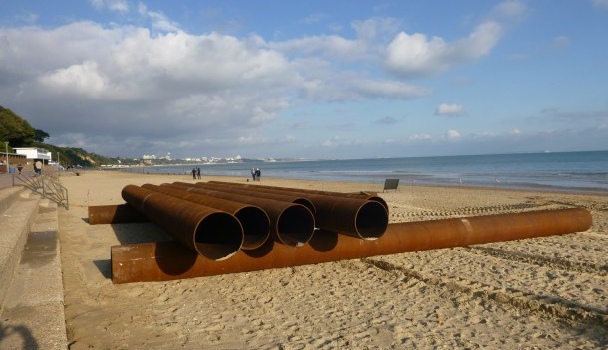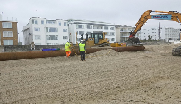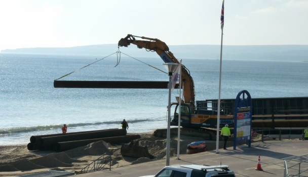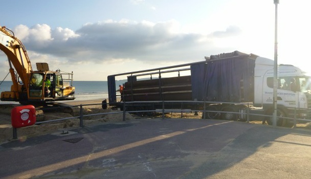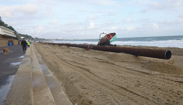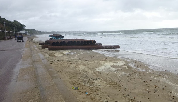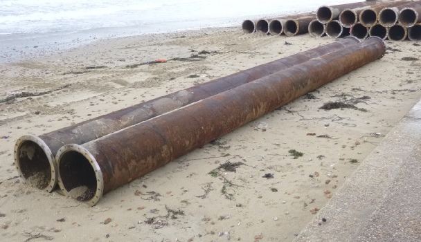 Day 3 12m sections of pipe for the sinkerline are delivered to the beach and stored ready for welding