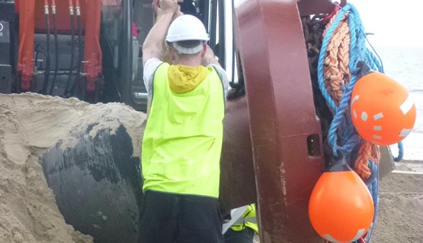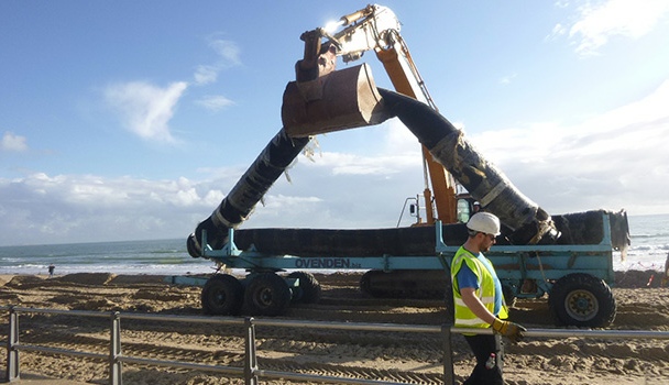 Day 15 The pipe is gently eased down the beach in preparation for tomorrow’s launch to sea