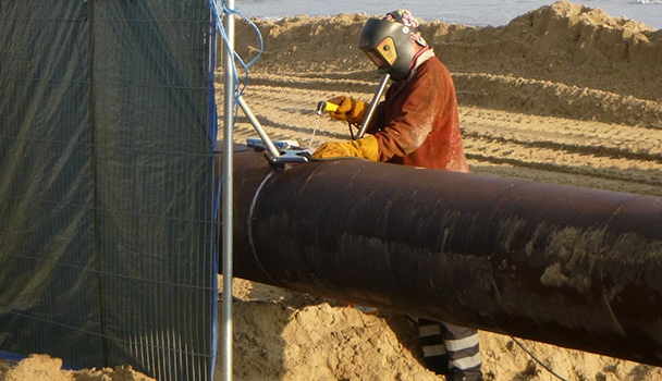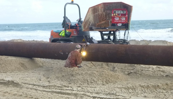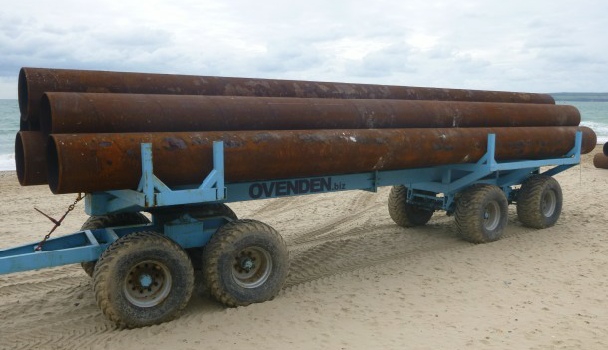 Day 4 Sections of pipe to be transported along the beach and welded together